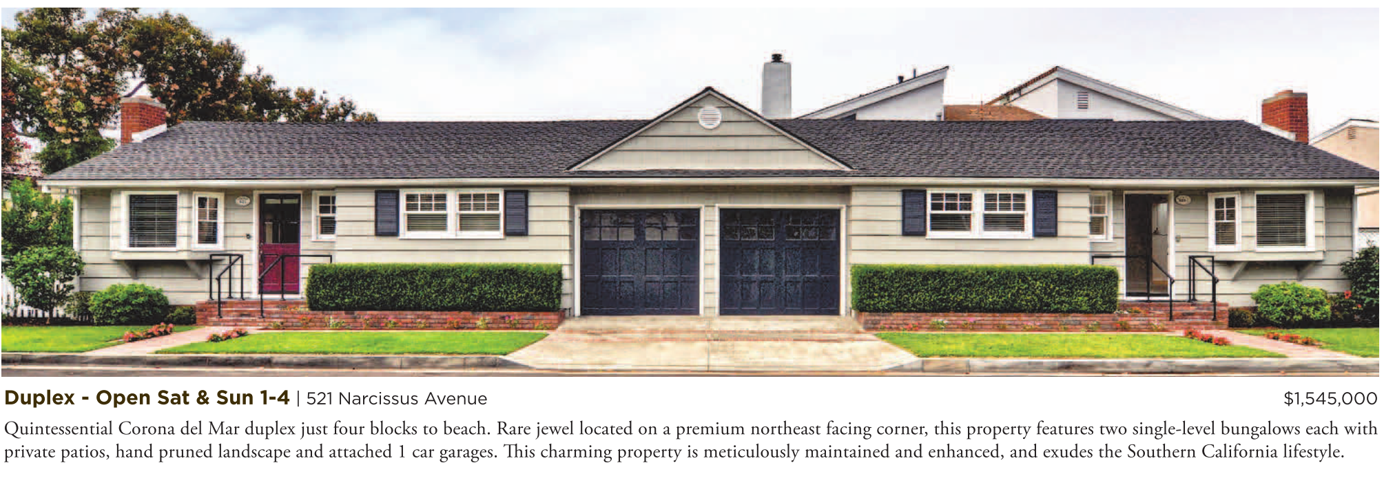 Quintessential Corona del Mar duplex just four blocks to beach. Rare jewel located on a premium northeast facing corner, this property features two single-level bungalows each with private patios, hand pruned landscape and attached 1 car garages. This charming property is meticulously maintained and enhanced, and exudes the Southern California lifestyle.