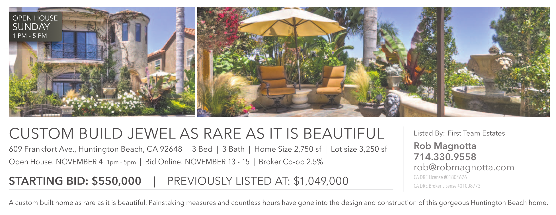 609 Frankfort Ave., Huntington Beach, CA 92648 | 3 Bed | 3 Bath | Home Size 2,750 sf | Lot size 3,250 sf Open House: NOVEMBER 4 1pm - 5pm | Bid Online: NOVEMBER 13 - 15 | Broker Co-op 2.5%