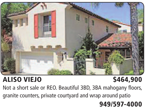 ALISO VIEJO $464,900 Not a short sale or REO. Beautiful 3BD, 3BA mahogany floors, granite counters, private courtyard and wrap around patio 949/597-4000