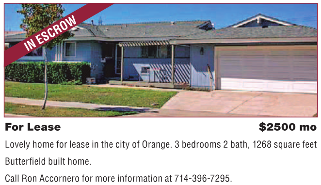 Lovely home for lease in the city of Orange. 3 bedrooms 2 bath, 1268 square feet Butterfi eld built home. Call Ron Accornero for more information at 714-396-7295.