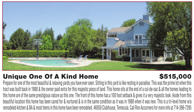 Unique One Of A Kind Home $515,000 Prepare for one of the most beautiful & relaxing yards you have ever seen. Sitting in this yard is like resting in paradise. This was the prime lot when this tract was built back in 1988 & the owner paid extra for this majestic piece of land. This home sits at the end of a cul-de-sac & all the homes leading to this home are of the same prestigious nature as this one. The front of this home has a 100 foot setback & gives it a very majestic look. Aside from this beautiful location this home has been cared for & nurtured & is in the same condition as it was in 1988 when it was new. This is a tri-level home w/a remodeled kitchen & BA & most items in this home have been remodeled. 46050 Clubhouse, Temecula. Call Ron Accornero for more info at 714-396-7295