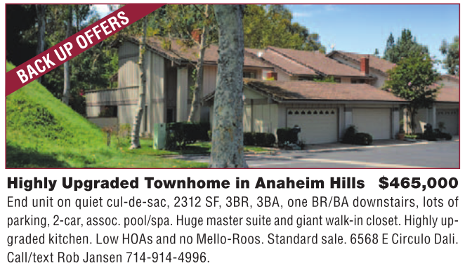 Highly Upgraded Townhome in Anaheim Hills $465,000 End unit on quiet cul-de-sac, 2312 SF, 3BR, 3BA, one BR/BA downstairs, lots of parking, 2-car, assoc. pool/spa. Huge master suite and giant walk-in closet. Highly upgraded kitchen. Low HOAs and no Mello-Roos. Standard sale. 6568 E Circulo Dali. Call/text Rob Jansen 714-914-4996.