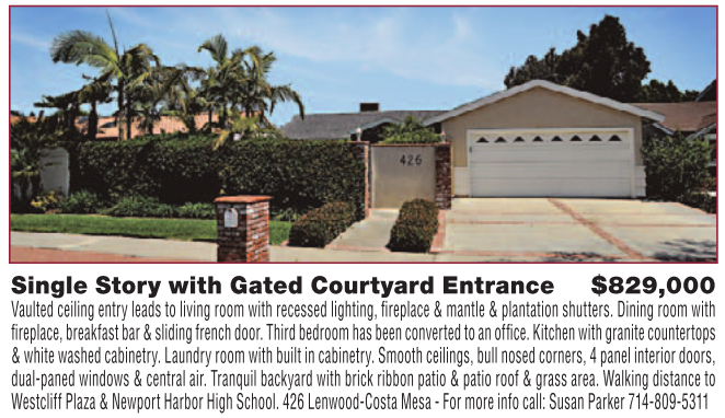 Single Story with Gated Courtyard Entrance $829,000 Vaulted ceiling entry leads to living room with recessed lighting, fi replace & mantle & plantation shutters. Dining room with fi replace, breakfast bar & sliding french door. Third bedroom has been converted to an offi ce. Kitchen with granite countertops & white washed cabinetry. Laundry room with built in cabinetry. Smooth ceilings, bull nosed corners, 4 panel interior doors, dual-paned windows & central air. Tranquil backyard with brick ribbon patio & patio roof & grass area. Walking distance to Westcliff Plaza & Newport Harbor High School. 426 Lenwood-Costa Mesa - For more info call: Susan Parker 714-809-5311