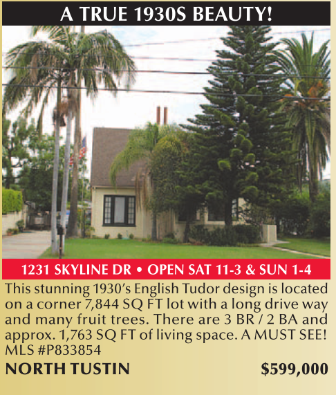 A TRUE 1930S BEAUTY! 1231 SKYLINE DR • OPEN SAT 11-3 & SUN 1-4 This stunning 1930’s English Tudor design is located on a corner 7,844 SQ FT lot with a long drive way and many fruit trees. There are 3 BR / 2 BA and approx. 1,763 SQ FT of living space. A MUST SEE! MLS #P833854 NORTH TUSTIN $599,000