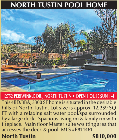 NORTH TUSTIN POOL HOME 12752 PERIWINKLE DR., NORTH TUSTIN • OPEN HOUSE SUN 1-4 This 4BD/3BA, 3300 SF home is situated in the desirable hills of North Tustin. Lot size is approx. 12,259 SQ FT with a relaxing salt water pool/spa surrounded by a large deck. Spacious living rm & family rm with fireplace. Main floor Master suite w/sitting area that accesses the deck & pool. MLS #P811461 North Tustin $810,000