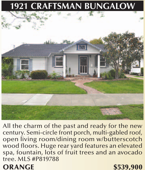 1921 CRAFTSMAN BUNGALOW All the charm of the past and ready for the new century. Semi-circle front porch, multi-gabled roof, open living room/dining room w/butterscotch wood floors. Huge rear yard features an elevated spa, fountain, lots of fruit trees and an avocado tree. MLS #P819788 ORANGE $539,900