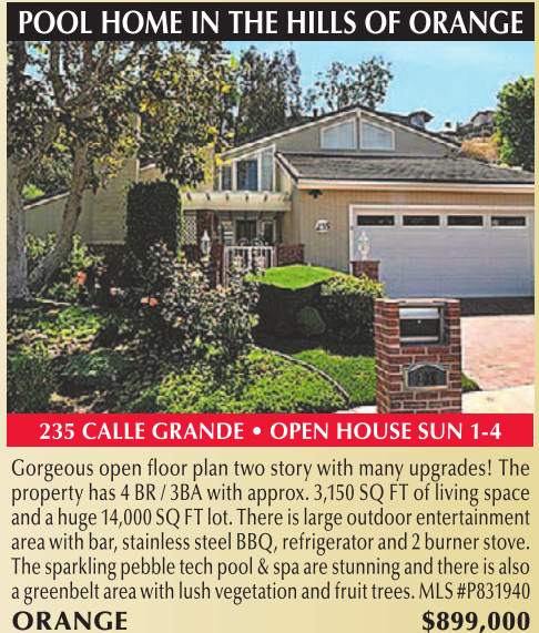 POOL HOME IN THE HILLS OF ORANGE 235 CALLE GRANDE • OPEN HOUSE SUN 1-4 Gorgeous open floor plan two story with many upgrades! The property has 4 BR / 3BA with approx. 3,150 SQ FT of living space and a huge 14,000 SQ FT lot. There is large outdoor entertainment area with bar, stainless steel BBQ, refrigerator and 2 burner stove. The sparkling pebble tech pool & spa are stunning and there is also a greenbelt area with lush vegetation and fruit trees. MLS #P831940 ORANGE $899,000