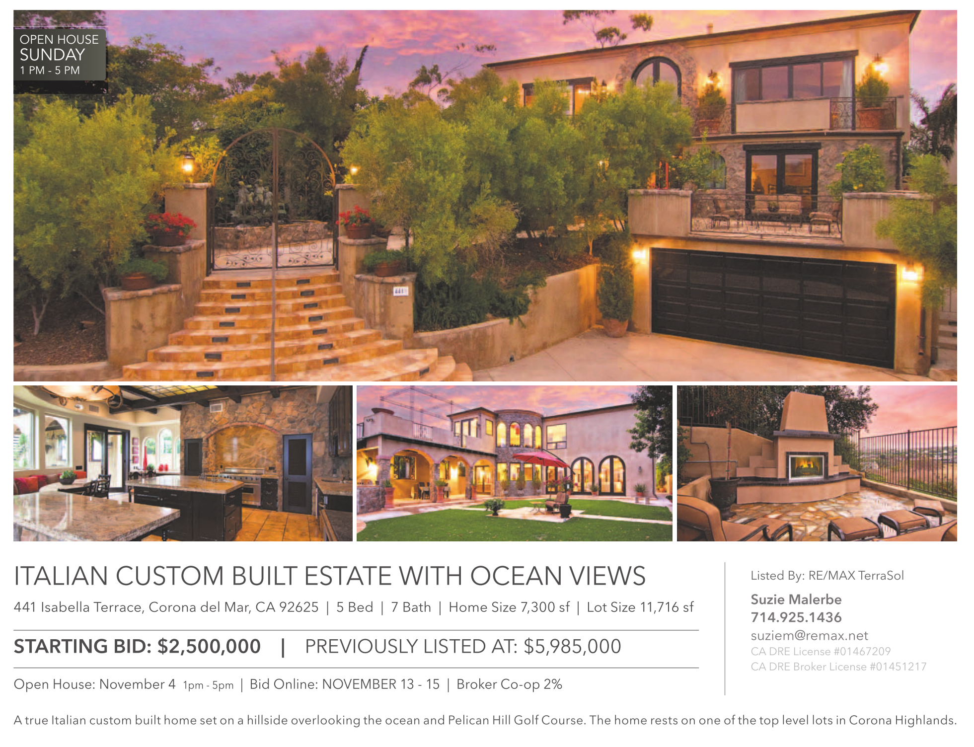OPEN HOUSE SUNDAY 1 PM - 5 PM ITALIAN CUSTOM BUILT ESTATE WITH OCEAN VIEWS 441 Isabella Terrace, Corona del Mar, CA 92625 | 5 Bed | 7 Bath | Home Size 7,300 sf | Lot Size 11,716 sf STARTING BID: $2,500,000 | PREVIOUSLY LISTED AT: $5,985,000 Open House: November 4 1pm - 5pm | Bid Online: NOVEMBER 13 - 15 | Broker Co-op 2% Listed By: RE/MAX TerraSol Suzie Malerbe 714.925.1436 suziem@remax.net CA DRE License #01467209 CA DRE Broker License #01451217 A true Italian custom built home set on a hillside overlooking the ocean and Pelican Hill Golf Course. The home rests on one of the top level lots in Corona Highlands. See also