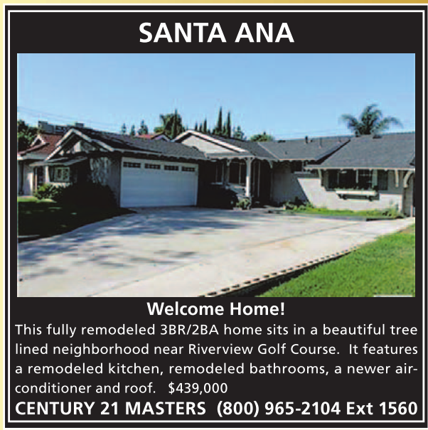 SANTA ANA Welcome Home! This fully remodeled 3BR/2BA home sits in a beautiful tree lined neighborhood near Riverview Golf Course. It features a remodeled kitchen, remodeled bathrooms, a newer airconditioner and roof. $439,000 CENTURY 21 MASTERS (800) 965-2104 Ext 1560
