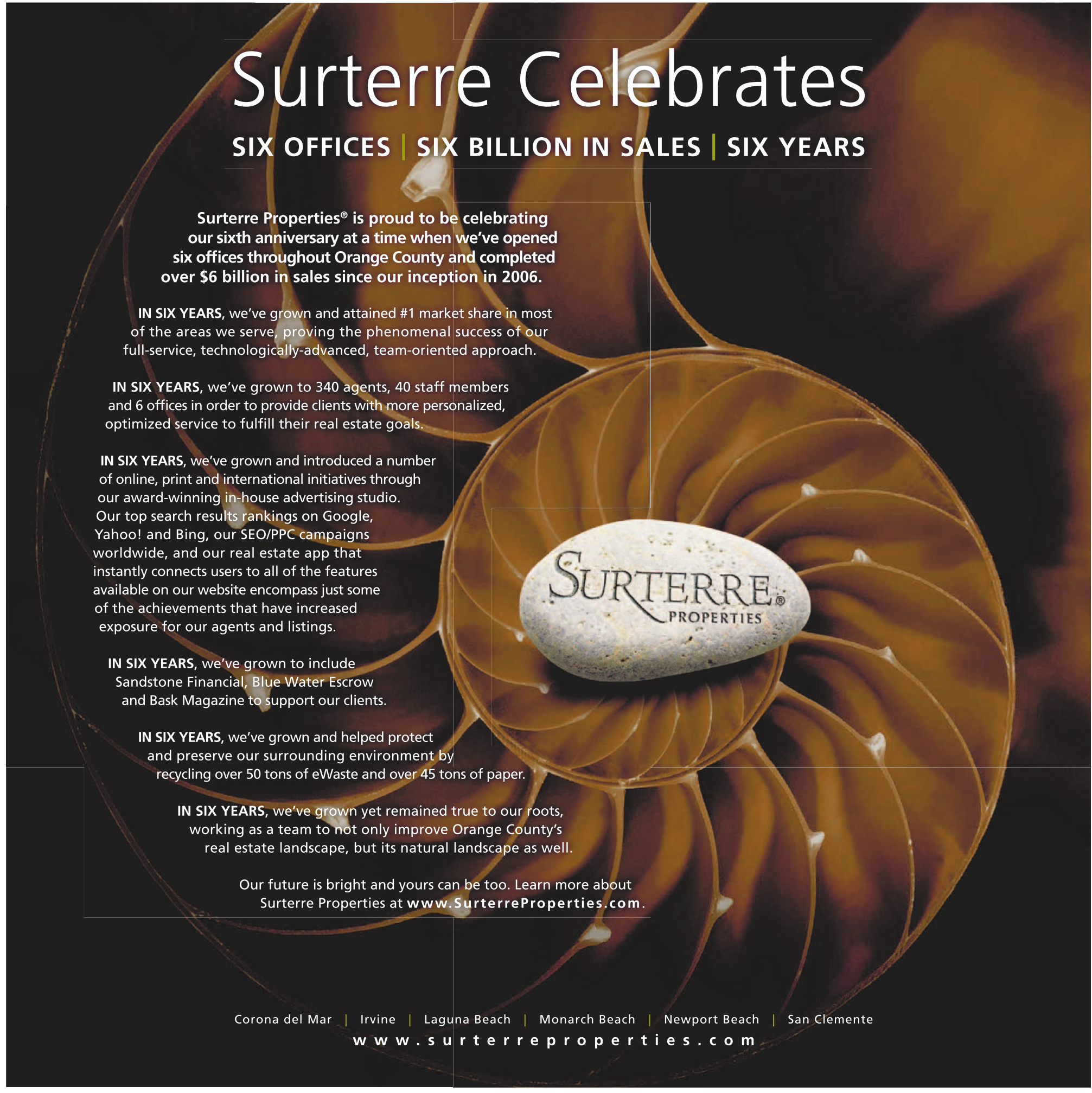 Surterre Properties ® is proud to be celebrating our sixth anniversary at a time when we’ve opened six offices throughout Orange County and completed over $6 billion in sales since our inception in 2006.