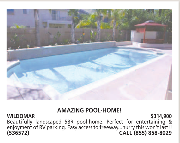 WILDOMAR $314,900 Beautifully landscaped 5BR pool-home. Perfect for entertaining & enjoyment of RV parking. Easy access to freeway...hurry this won’t last!! (536572) CALL (855) 858-8029