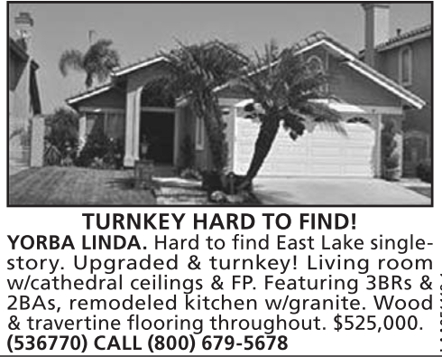 TURNKEY HARD TO FIND! YORBA LINDA. Hard to find East Lake singlestory. Upgraded & turnkey! Living room w/cathedral ceilings & FP. Featuring 3BRs & 2BAs, remodeled kitchen w/granite. Wood & travertine flooring throughout. $525,000. (536770) CALL (800) 679-5678