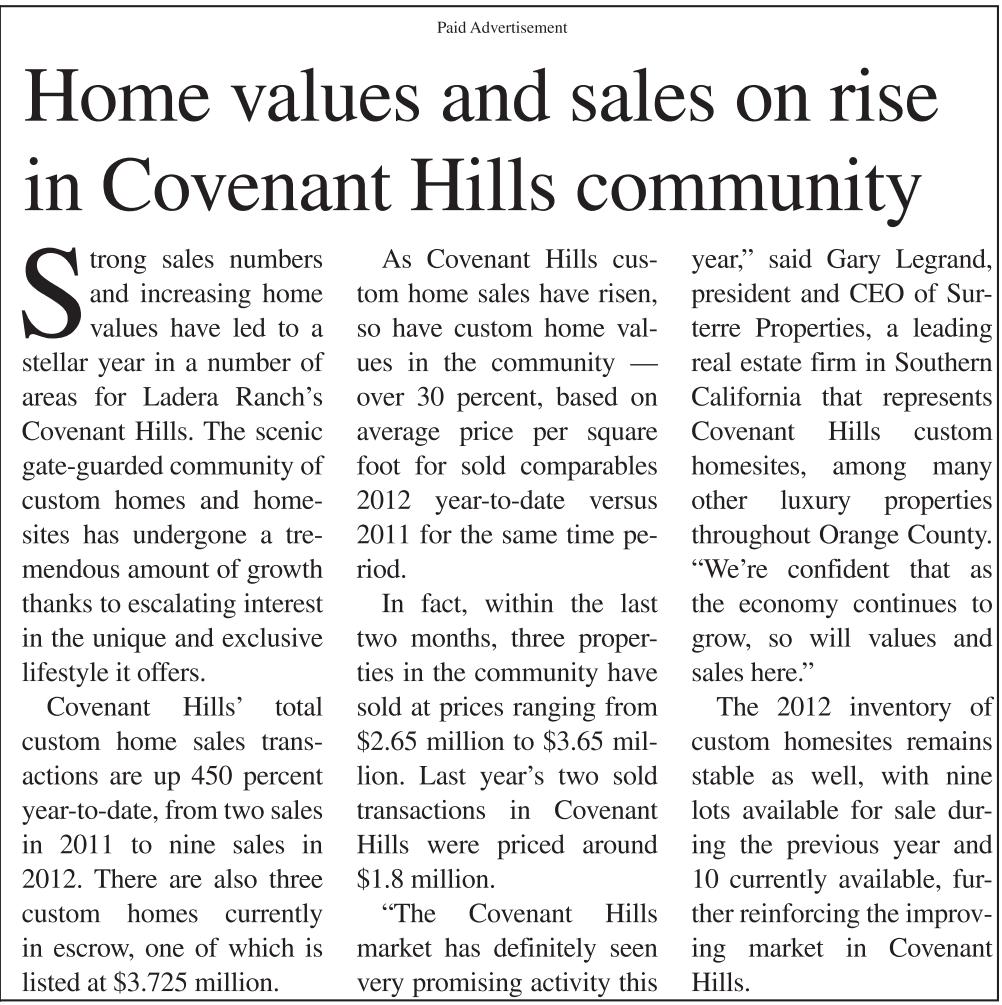 Strong sales numbers and increasing home values have led to a stellar year in a number of areas for Ladera Ranch’s Covenant Hills. The scenic gate-guarded community of custom homes and homesites has undergone a tremendous amount of growth thanks to escalating interest in the unique and exclusive lifestyle it offers. Covenant Hills’ total custom home sales transactions are up 450 percent year-to-date, from two sales in 2011 to nine sales in 2012. There are also three custom homes currently in escrow, one of which is listed at $3.725 million. Paid Advertisement Home values and sales on rise in Covenant Hills community As Covenant Hills custom home sales have risen, so have custom home values in the community — over 30 percent, based on average price per square foot for sold comparables 2012 year-to-date versus 2011 for the same time period. In fact, within the last two months, three properties in the community have sold at prices ranging from $2.65 million to $3.65 million. Last year’s two sold transactions in Covenant Hills were priced around $1.8 million. “The Covenant Hills market has definitely seen very promising activity this year,” said Gary Legrand, president and CEO of Surterre Properties, a leading real estate firm in Southern California that represents Covenant Hills custom homesites, among many other luxury properties throughout Orange County. “We’re confident that as the economy continues to grow, so will values and sales here.” The 2012 inventory of custom homesites remains stable as well, with nine lots available for sale during the previous year and 10 currently available, further reinforcing the improving market in Covenant Hills.