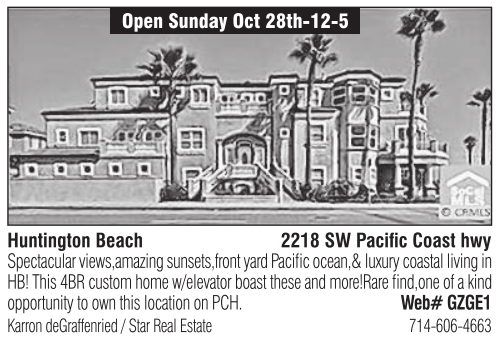 Open Sunday Oct 28th-12-5 Huntington Beach 2218 SW Pacific Coast hwy Spectacular views,amazing sunsets,front yard Pacific ocean,& luxury coastal living in HB! This 4BR custom home w/elevator boast these and more!Rare find,one of a kind opportunity to own this location on PCH. Web# GZGE1 Karron deGraffenried / Star Real Estate 714-606-4663