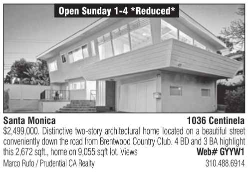 Open Sunday 1-4 *Reduced* Santa Monica 1036 Centinela $2,499,000. Distinctive two-story architectural home located on a beautiful street conveniently down the road from Brentwood Country Club. 4 BD and 3 BA highlight this 2,672 sqft., home on 9,055 sqft lot. Views Web# GYYW1 Marco Rufo / Prudential CA Realty 310.488.6914
