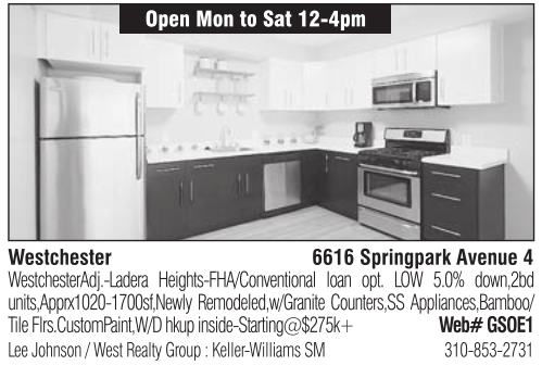 Open Mon to Sat 12-4pm Westchester 6616 Springpark Avenue 4 WestchesterAdj.-Ladera Heights-FHA/Conventional loan opt. LOW 5.0% down,2bd units,Apprx1020-1700sf,Newly Remodeled,w/Granite Counters,SS Appliances,Bamboo/ Tile Flrs.CustomPaint,W/D hkup inside-Starting@$275k+ Web# GSOE1 Lee Johnson / West Realty Group : Keller-Williams SM 310-853-2731 See also