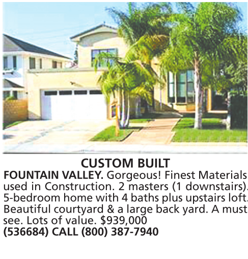 CUSTOM BUILT FOUNTAIN VALLEY. Gorgeous! Finest Materials used in Construction. 2 masters (1 downstairs). 5-bedroom home with 4 baths plus upstairs loft. Beautiful courtyard & a large back yard. A must see. Lots of value. $939,000 (536684) CALL (800) 387-7940