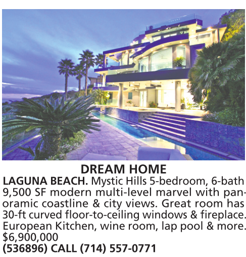 DREAM HOME LAGUNA BEACH. Mystic Hills 5-bedroom, 6-bath 9,500 SF modern multi-level marvel with panoramic coastline & city views. Great room has 30-ft curved floor-to-ceiling windows & fireplace. European Kitchen, wine room, lap pool & more. $6,900,000 (536896) CALL (714) 557-0771