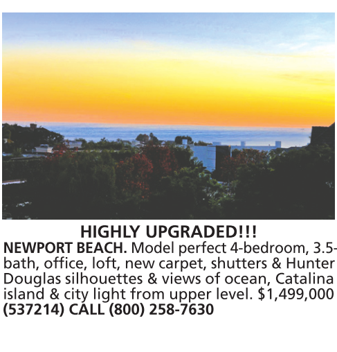 NEWPORT BEACH. Model perfect 4-bedroom, 3.5- bath, office, loft, new carpet, shutters & Hunter Douglas silhouettes & views of ocean, Catalina island & city light from upper level. $1,499,000 (537214) CALL (800) 258-7630