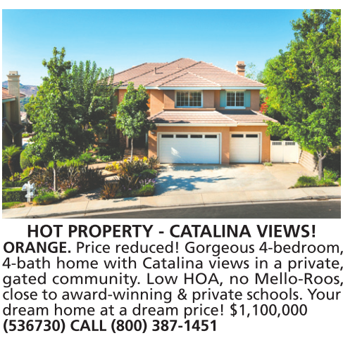 HOT PROPERTY - CATALINA VIEWS! ORANGE. Price reduced! Gorgeous 4-bedroom, 4-bath home with Catalina views in a private, gated community. Low HOA, no Mello-Roos, close to award-winning & private schools. Your dream home at a dream price! $1,100,000 (536730) CALL (800) 387-1451