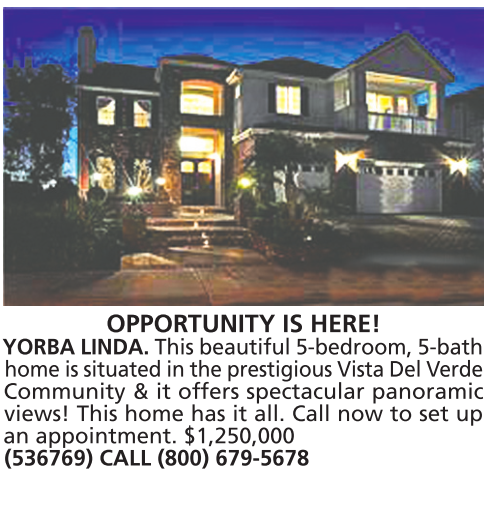 OPPORTUNITY IS HERE! YORBA LINDA. This beautiful 5-bedroom, 5-bath home is situated in the prestigious Vista Del Verde Community & it offers spectacular panoramic views! This home has it all. Call now to set up an appointment. $1,250,000 (536769) CALL (800) 679-5678