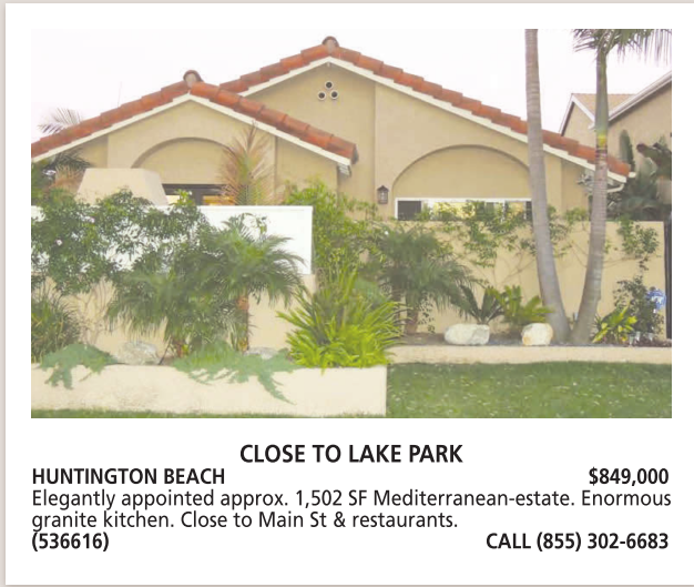 CLOSE TO LAKE PARK HUNTINGTON BEACH $849,000 Elegantly appointed approx. 1,502 SF Mediterranean-estate. Enormous granite kitchen. Close to Main St & restaurants. (536616) CALL (855) 302-6683