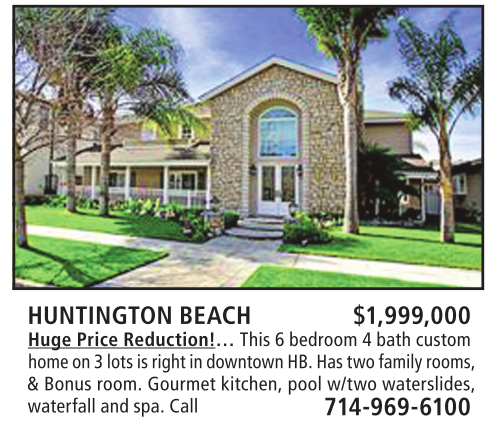 HUNTINGTON BEACH $1,999,000 Huge Price Reduction!… This 6 bedroom 4 bath custom home on 3 lots is right in downtown HB. Has two family rooms, & Bonus room. Gourmet kitchen, pool w/two waterslides, waterfall and spa. Call 714-969-6100