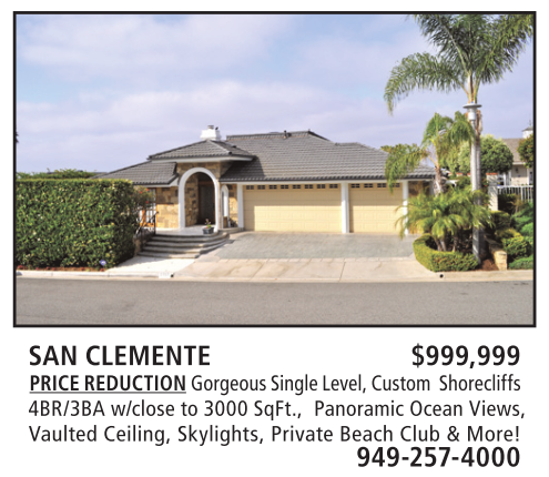 SAN CLEMENTE $999,999 PRICE REDUCTION Gorgeous Single Level, Custom Shorecliffs 4BR/3BA w/close to 3000 SqFt., Panoramic Ocean Views, Vaulted Ceiling, Skylights, Private Beach Club & More!