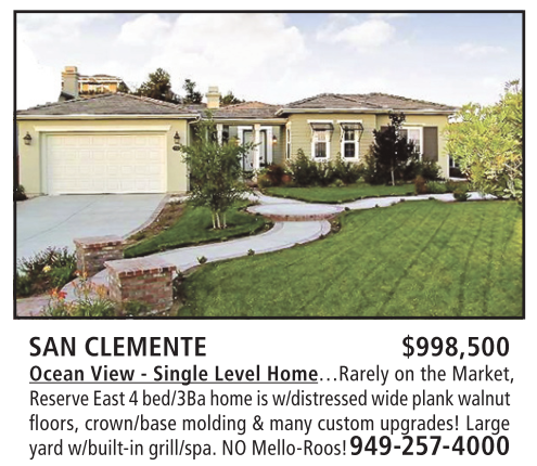 SAN CLEMENTE $998,500 Ocean View - Single Level Home…Rarely on the Market, Reserve East 4 bed/3Ba home is w/distressed wide plank walnut fl oors, crown/base molding & many custom upgrades! Large yard w/built-in grill/spa. NO Mello-Roos! 949-257-4000