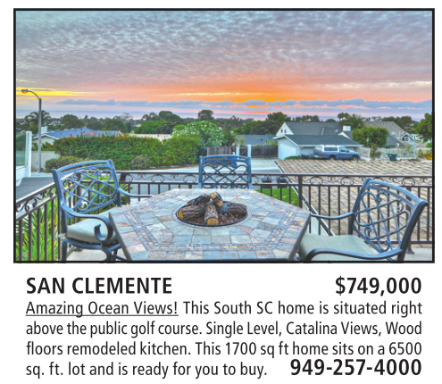 SAN CLEMENTE $749,000 Amazing Ocean Views! This South SC home is situated right above the public golf course. Single Level, Catalina Views, Wood floors remodeled kitchen. This 1700 sq ft home sits on a 6500 sq. ft. lot and is ready for you to buy. 949-257-4000