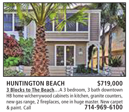 HUNTINGTON BEACH $719,000 3 Blocks to The Beach…A 3 bedroom, 3 bath downtown HB home w/cherrywood cabinets in kitchen, granite counters, new gas range, 2 fireplaces, one in huge master. New carpet & paint. Call 714-969-6100