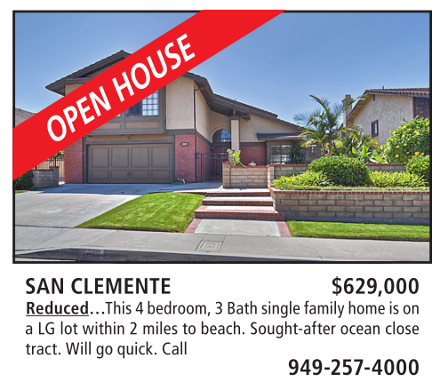 SAN CLEMENTE $629,000 Reduced…This 4 bedroom, 3 Bath single family home is on a LG lot within 2 miles to beach. Sought-after ocean close tract. Will go quick. Call 949-257-4000