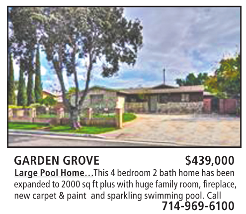 GARDEN GROVE $439,000 Large Pool Home…This 4 bedroom 2 bath home has been expanded to 2000 sq ft plus with huge family room, fireplace, new carpet & paint  and sparkling swimming pool. Call 714-969-6100