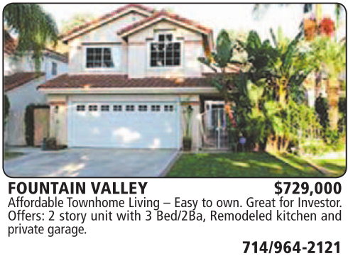 FOUNTAIN VALLEY $729,000 Affordable Townhome Living – Easy to own. Great for Investor. Offers: 2 story unit with 3 Bed/2Ba, Remodeled kitchen and private garage.