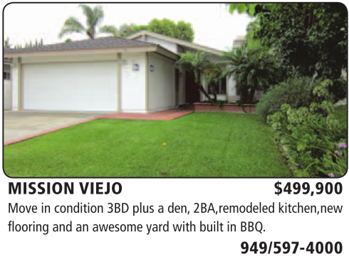 MISSION VIEJO $499,900 Move in condition 3BD plus a den, 2BA,remodeled kitchen,new flooring and an awesome yard with built in BBQ.
