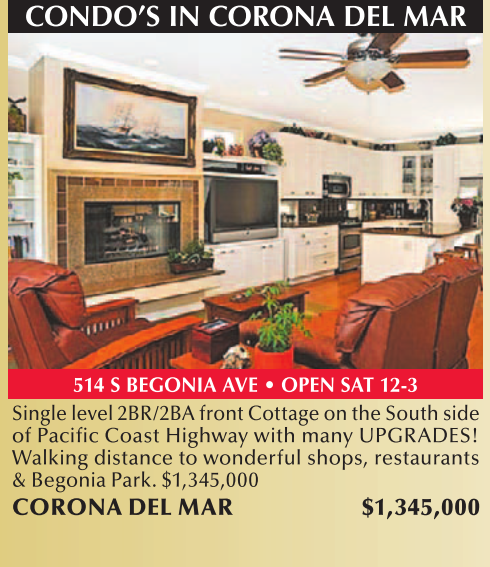 CONDO’S IN CORONA DEL MAR 514 S BEGONIA AVE • OPEN SAT 12-3 Single level 2BR/2BA front Cottage on the South side of Pacific Coast Highway with many UPGRADES! Walking distance to wonderful shops, restaurants & Begonia Park. $1,345,000 CORONA DEL MAR $1,345,000