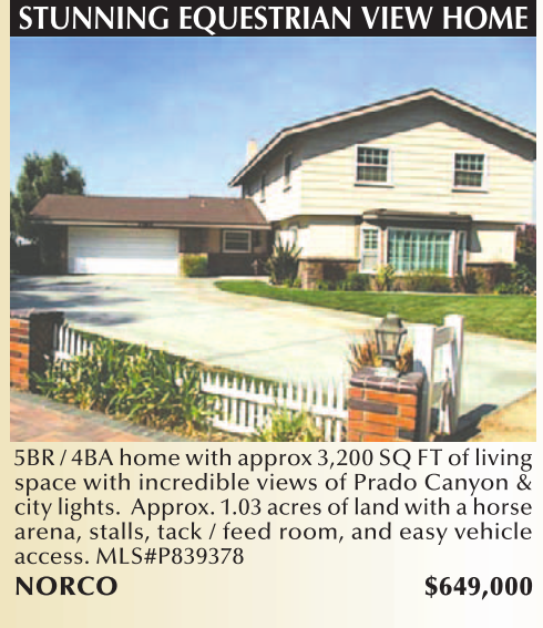 5BR / 4BA home with approx 3,200 SQ FT of living space with incredible views of Prado Canyon & city lights. Approx. 1.03 acres of land with a horse arena, stalls, tack / feed room, and easy vehicle