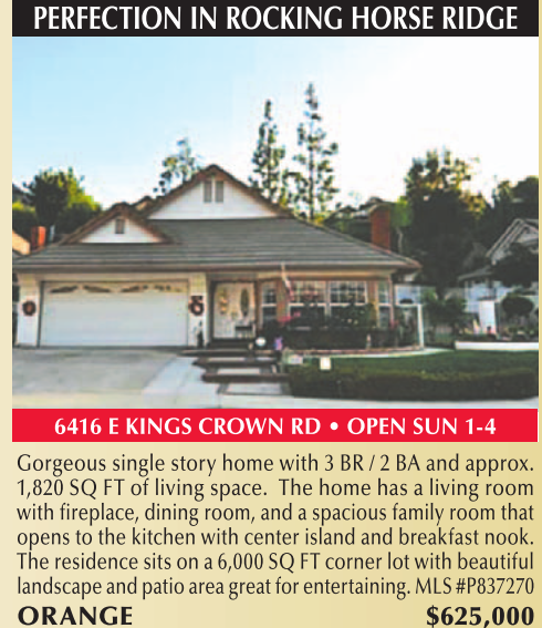 PERFECTION IN ROCKING HORSE RIDGE 6416 E KINGS CROWN RD • OPEN SUN 1-4 Gorgeous single story home with 3 BR / 2 BA and approx. 1,820 SQ FT of living space. The home has a living room with fireplace, dining room, and a spacious family room that opens to the kitchen with center island and breakfast nook. The residence sits on a 6,000 SQ FT corner lot with beautiful landscape and patio area great for entertaining. MLS #P837270 ORANGE $625,000