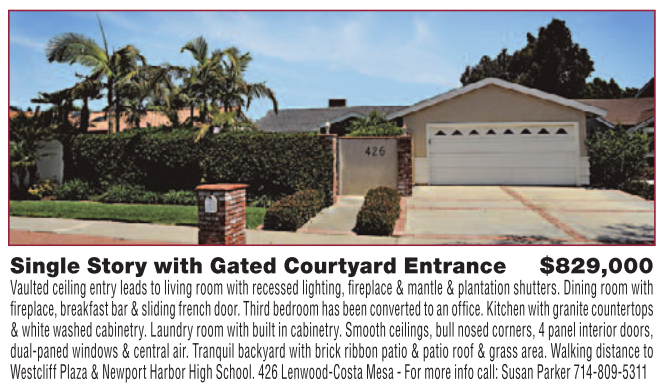 Single Story with Gated Courtyard Entrance $829,000 Vaulted ceiling entry leads to living room with recessed lighting, fi replace & mantle & plantation shutters. Dining room with fi replace, breakfast bar & sliding french door. Third bedroom has been converted to an offi ce. Kitchen with granite countertops & white washed cabinetry. Laundry room with built in cabinetry. Smooth ceilings, bull nosed corners, 4 panel interior doors, dual-paned windows & central air. Tranquil backyard with brick ribbon patio & patio roof & grass area. Walking distance to Westcliff Plaza & Newport Harbor High School. 426 Lenwood-Costa Mesa - For more info call: Susan Parker 714-809-5311