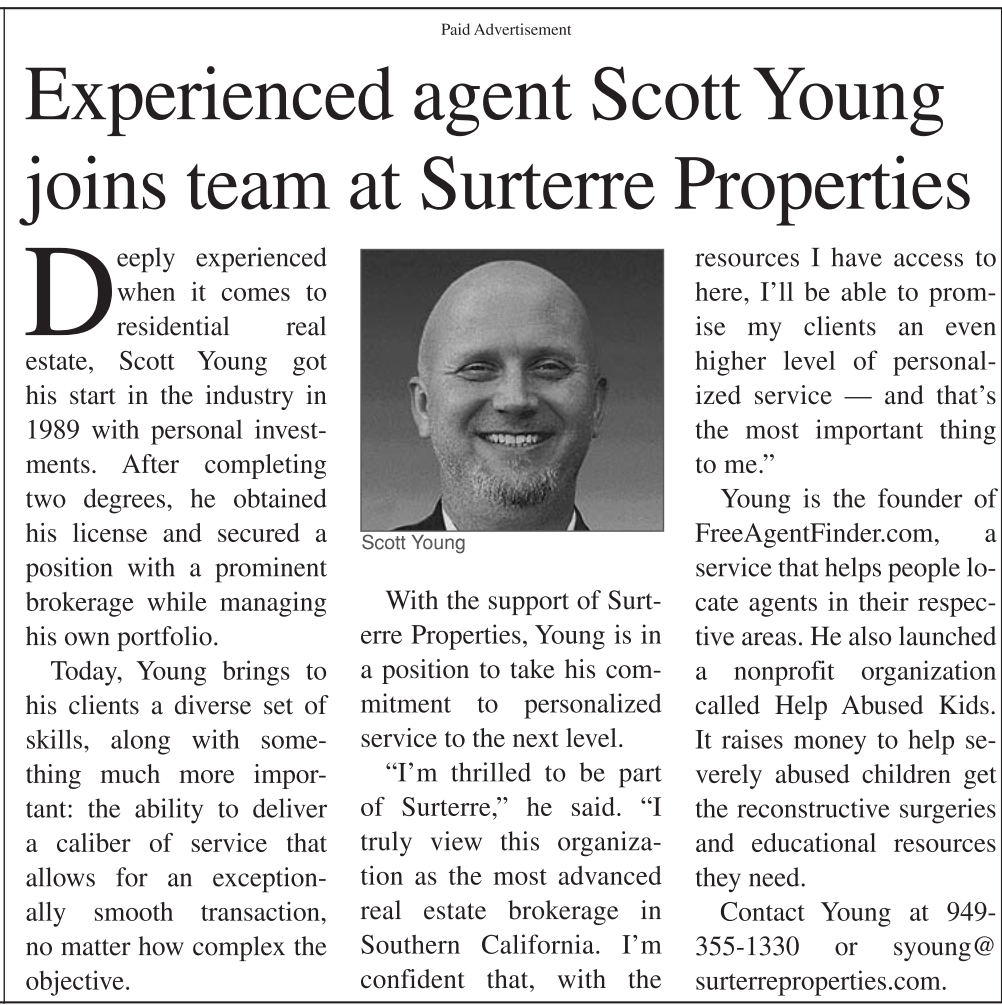Deeply experienced when it comes to residential real estate, Scott Young got his start in the industry in 1989 with personal investments. After completing two degrees, he obtained his license and secured a position with a prominent brokerage while managing his own portfolio. Today, Young brings to his clients a diverse set of skills, along with something much more important: the ability to deliver a caliber of service that allows for an exceptionally smooth transaction, no matter how complex the objective. Paid Advertisement Experienced agent Scott Young joins team at Surterre Properties Scott Young With the support of Surterre Properties, Young is in a position to take his commitment to personalized service to the next level. “I’m thrilled to be part of Surterre,” he said. “I truly view this organization as the most advanced real estate brokerage in Southern California. I’m confident that, with the resources I have access to here, I’ll be able to promise my clients an even higher level of personalized service — and that’s the most important thing to me.” Young is the founder of FreeAgentFinder.com, a service that helps people locate agents in their respective areas. He also launched a nonprofit organization called Help Abused Kids. It raises money to help severely abused children get the reconstructive surgeries and educational resources they need. Contact Young at 949- 355-1330 or syoung@ surterreproperties.com.