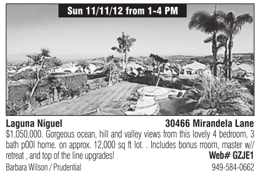 Laguna Niguel 30466 Mirandela Lane $1,050,000. Gorgeous ocean, hill and valley views from this lovely 4 bedroom, 3 bath p00l home. on approx. 12,000 sq ft lot. . Includes bonus rroom, master w// retreat , and top of the line upgrades! Web# GZJE1 Barbara Wilson / Prudential 949-584-0662