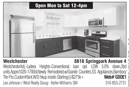 Westchester 6616 Springpark Avenue 4 WestchesterAdj.-Ladera Heights-Conventional loan opt. LOW 5.0% down,2bd units,Apprx1020-1700sf,Newly Remodeled,w/Granite Counters,SS Appliances,Bamboo/ Tile Flrs.CustomPaint,W/D hkup inside-Starting@$275k+ Web# GSOE1
