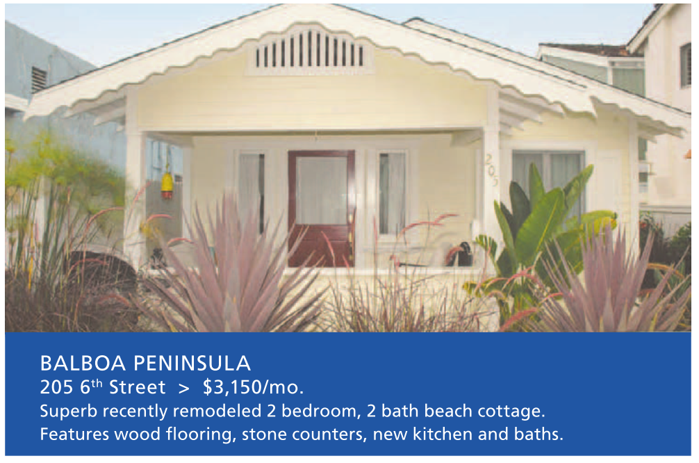 BALBOA PENINSULA 205 6 th Street > $3,150/mo. Superb recently remodeled 2 bedroom, 2 bath beach cottage. Features wood flooring, stone counters, new kitchen and baths.