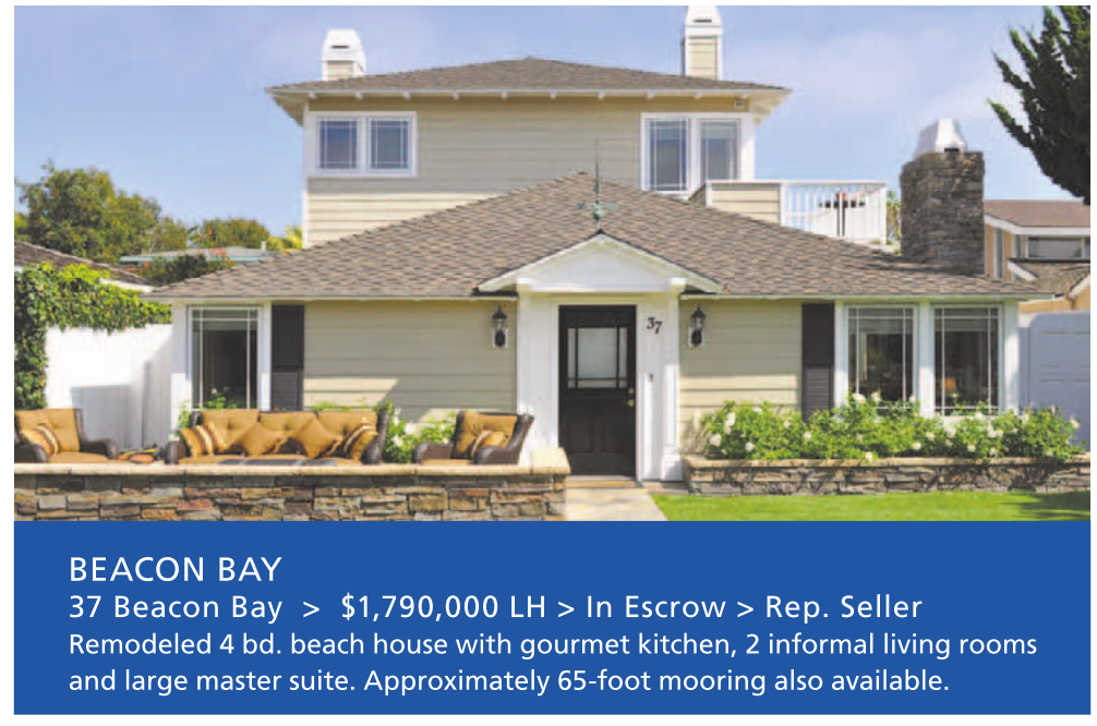 BEACON BAY 37 Beacon Bay > $1,790,000 LH > In Escrow > Rep. Seller Remodeled 4 bd. beach house with gourmet kitchen, 2 informal living rooms and large master suite. Approximately 65-foot mooring also available.