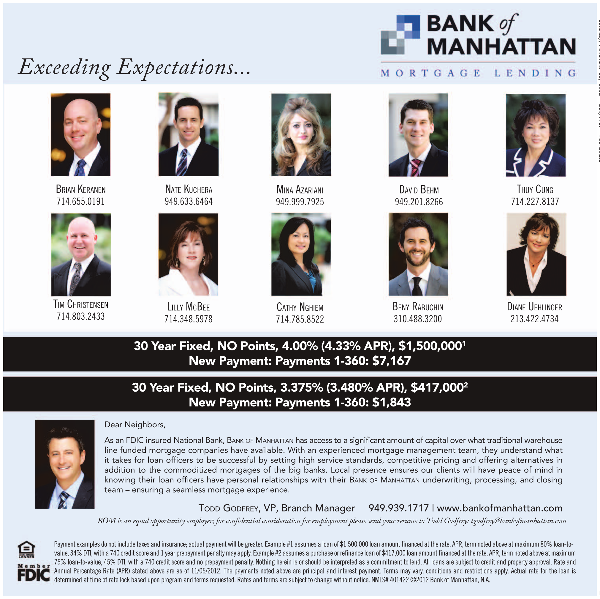 Payment examples do not include taxes and insurance; actual payment will be greater. Example #1 assumes a loan of $1,500,000 loan amount financed at the rate, APR, term noted above at maximum 80% loan-tovalue, 34% DTI, with a 740 credit score and 1 year prepayment penalty may apply. Example #2 assumes a purchase or refinance loan of $417,000 loan amount financed at the rate, APR, term noted above at maximum 75% loan-to-value, 45% DTI, with a 740 credit score and no prepayment penalty. Nothing herein is or should be interpreted as a commitment to lend. All loans are subject to credit and property approval. Rate and Annual Percentage Rate (APR) stated above are as of 11/05/2012. The payments noted above are principal and interest payment. Terms may vary, conditions and restrictions apply. Actual rate for the loan is determined at time of rate lock based upon program and terms requested. Rates and terms are subject to change without notice. NMLS# 401422 ©2012 Bank of Manhattan, N.A.