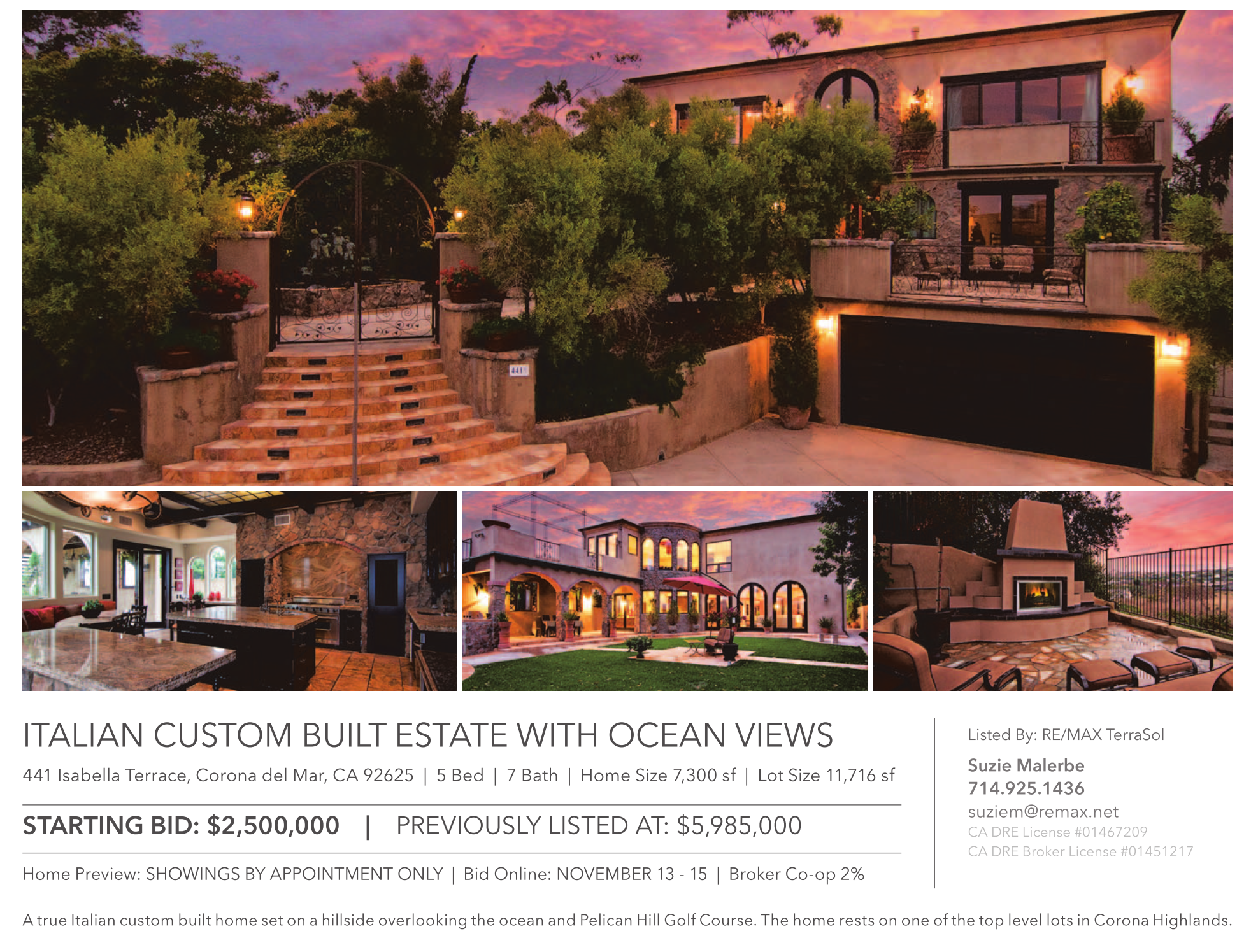 ITALIAN CUSTOM BUILT ESTATE WITH OCEAN VIEWS 441 Isabella Terrace, Corona del Mar, CA 92625 | 5 Bed | 7 Bath | Home Size 7,300 sf | Lot Size 11,716 sf STARTING BID: $2,500,000 | PREVIOUSLY LISTED AT: $5,985,000 Home Preview: SHOWINGS BY APPOINTMENT ONLY | Bid Online: NOVEMBER 13 - 15 | Broker Co-op 2% Listed By: RE/MAX TerraSol Suzie Malerbe 714.925.1436 suziem@remax.net CA DRE License #01467209 CA DRE Broker License #01451217 A true Italian custom built home set on a hillside overlooking the ocean and Pelican Hill Golf Course. The home rests on one of the top level lots in Corona Highlands.