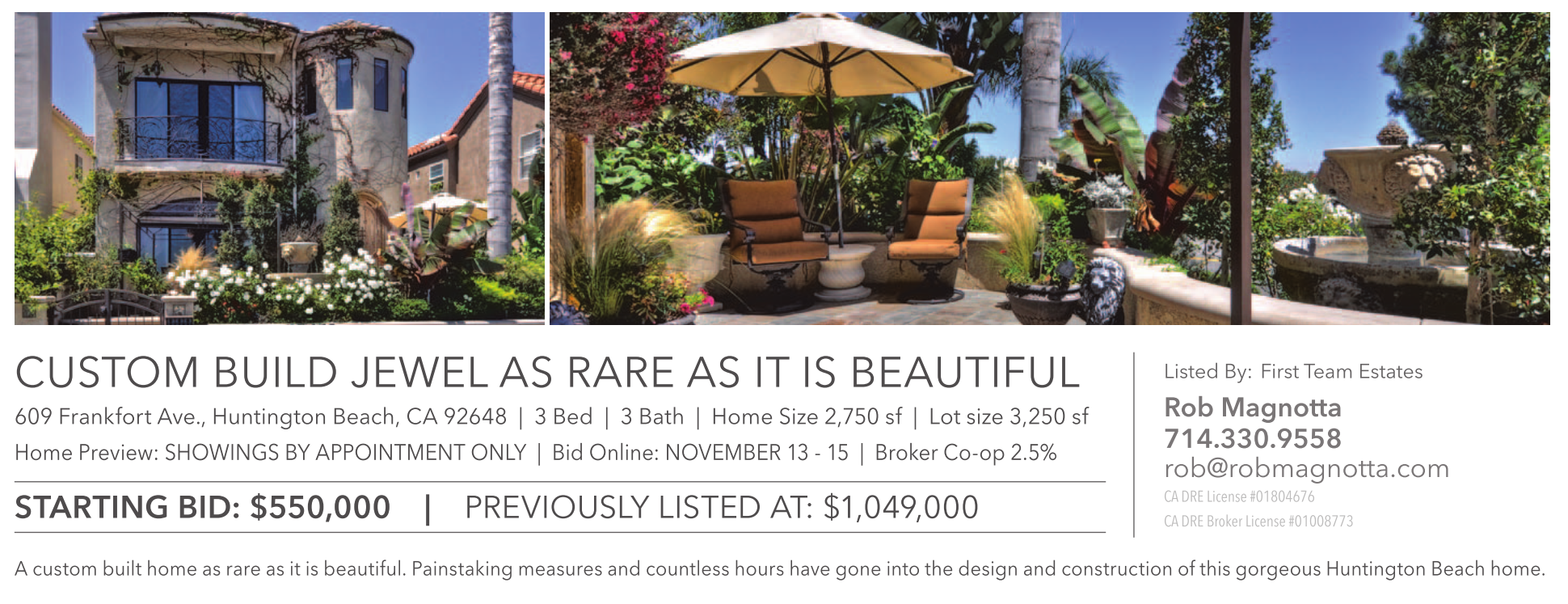 CUSTOM BUILD JEWEL AS RARE AS IT IS BEAUTIFUL 609 Frankfort Ave., Huntington Beach, CA 92648 | 3 Bed | 3 Bath | Home Size 2,750 sf | Lot size 3,250 sf Home Preview: SHOWINGS BY APPOINTMENT ONLY | Bid Online: NOVEMBER 13 - 15 | Broker Co-op 2.5% STARTING BID: $550,000 | PREVIOUSLY LISTED AT: $1,049,000 Listed By: First Team Estates Rob Magnotta 714.330.9558 rob@robmagnotta.com CA DRE License #01804676 CA DRE Broker License #01008773 A custom built home as rare as it is beautiful. Painstaking measures and countless hours have gone into the design and construction of this gorgeous Huntington Beach home.