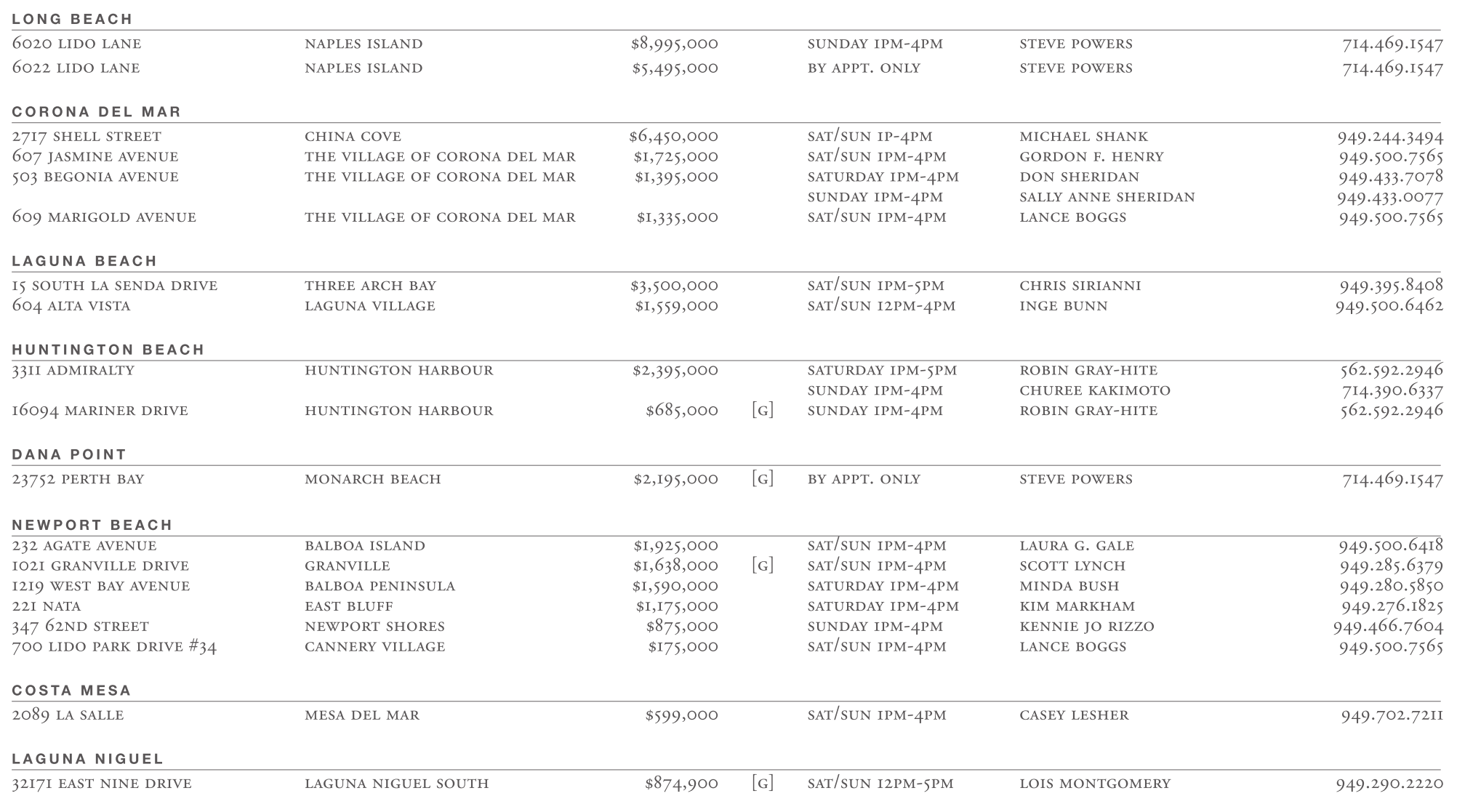 NEWPORT BEACH 232 agate avenue balboa island $1,925,000 sat/sun 1pm-4pm laura g. gale 949.500.6418 1021 granville drive granville $1,638,000 [g] sat/sun 1pm-4pm scott lynch 949.285.6379 1219 west bay avenue balboa peninsula $1,590,000 saturday 1pm-4pm minda bush 949.280.5850 221 nata east bluff $1,175,000 saturday 1pm-4pm kim markham 949.276.1825 347 62nd street newport shores $875,000 sunday 1pm-4pm kennie jo rizzo 949.466.7604 700 lido park drive #34 cannery village $175,000 sat/sun 1pm-4pm lance boggs 949.500.7565