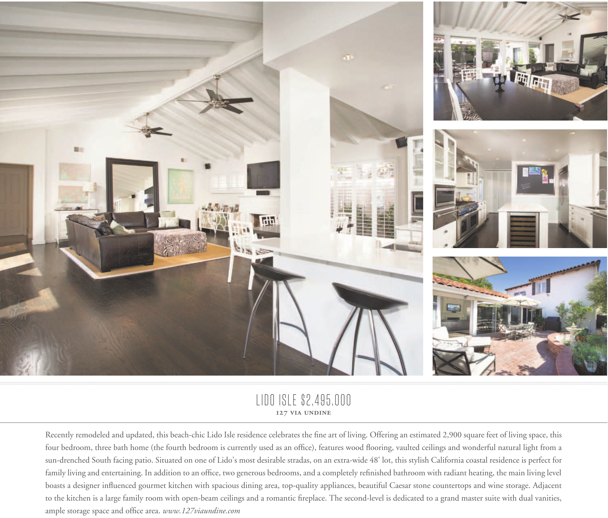 LIDO ISLE $2,495,000 127 via undine Recently remodeled and updated, this beach-chic Lido Isle residence celebrates the fine art of living. Offering an estimated 2,900 square feet of living space, this four bedroom, three bath home (the fourth bedroom is currently used as an office), features wood flooring, vaulted ceilings and wonderful natural light from a sun-drenched South facing patio. Situated on one of Lido’s most desirable stradas, on an extra-wide 48' lot, this stylish California coastal residence is perfect for family living and entertaining. In addition to an office, two generous bedrooms, and a completely refinished bathroom with radiant heating, the main living level boasts a designer influenced gourmet kitchen with spacious dining area, top-quality appliances, beautiful Caesar stone countertops and wine storage. Adjacent to the kitchen is a large family room with open-beam ceilings and a romantic fireplace. The second-level is dedicated to a grand master suite with dual vanities, ample storage space and office area. www.127viaundine.com