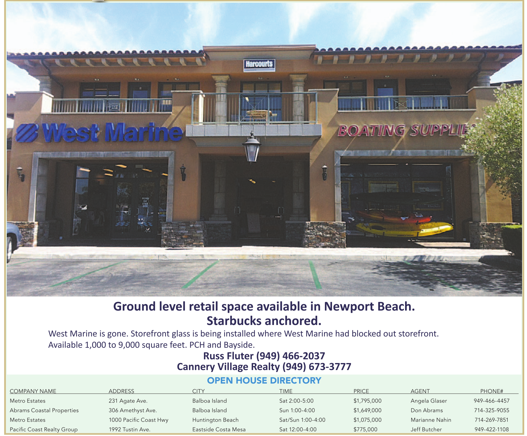 COMPANY NAME ADDRESS CITY TIME PRICE AGENT PHONE# Metro Estates 231 Agate Ave. Balboa Island Sat 2:00-5:00 $1,795,000 Angela Glaser 949-466-4457 Abrams Coastal Properties 306 Amethyst Ave. Balboa Island Sun 1:00-4:00 $1,649,000 Don Abrams 714-325-9055 Metro Estates 1000 Pacific Coast Hwy Huntington Beach Sat/Sun 1:00-4:00 $1,075,000 Marianne Nahin 714-269-7851 Pacific Coast Realty Group 1992 Tustin Ave. Eastside Costa Mesa Sat 12:00-4:00 $775,000 Jeff Butcher 949-422-1108